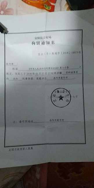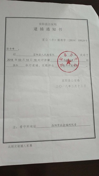 2018年2月27日,张红在家中又被宜阳县公安局以“寻衅滋事罪”带走,关押在洛阳市看守所,2018年3月14日,已被宜阳县检察院批准逮捕。
