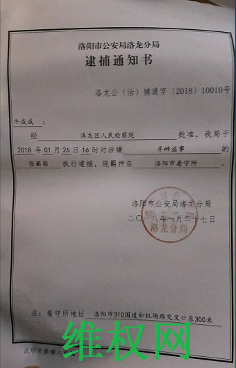 2018年1月27日,洛阳市公安局洛龙分局向张葡萄的儿子送达了逮捕通知书,于2018年1月26日对张葡萄执行逮捕,羁押在洛阳市看守所。