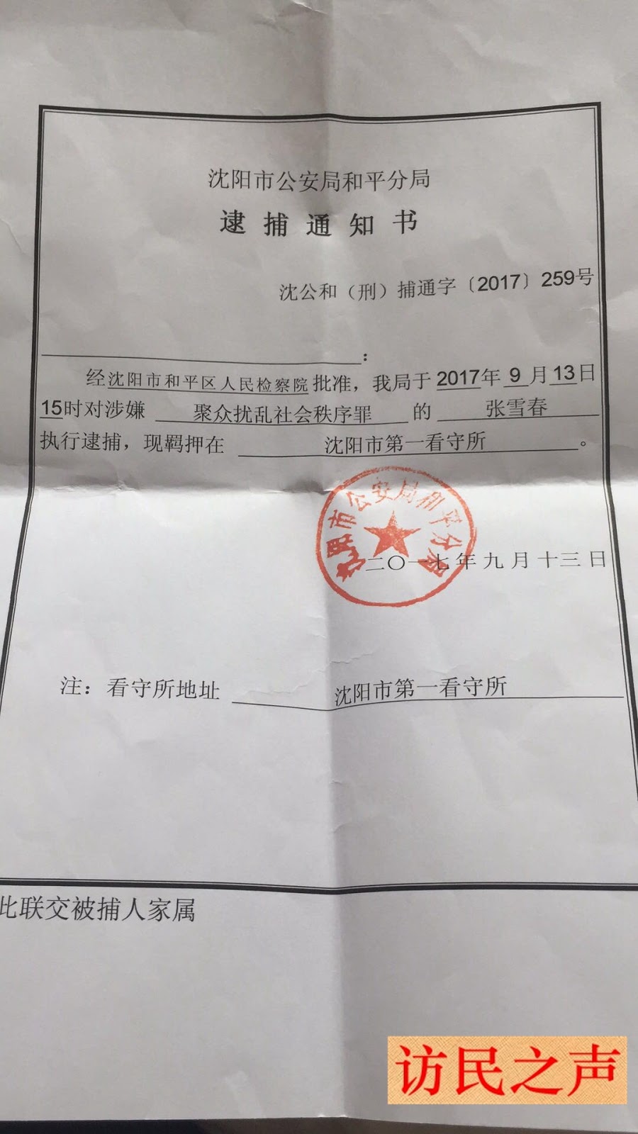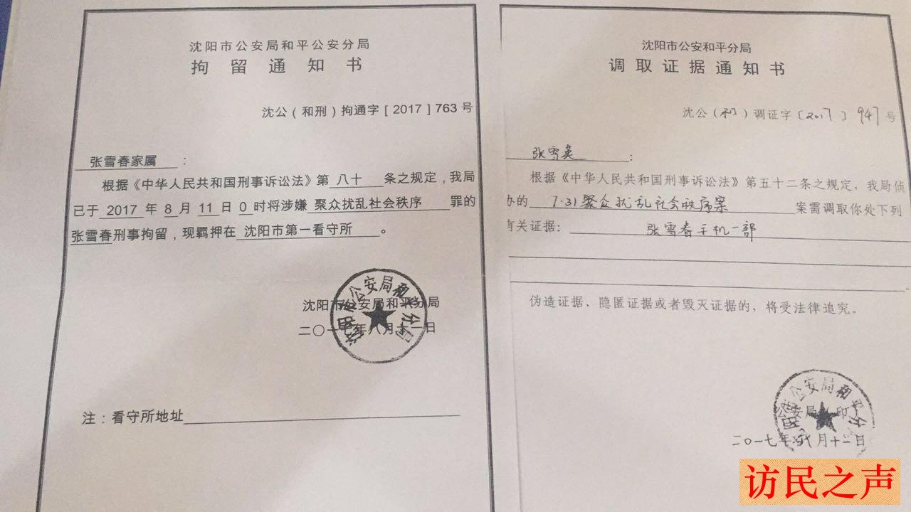 2017年8月11日,张雪春被沈阳市公安局和平分局以涉嫌“聚众扰乱社会秩序罪”刑事拘留,9月13日,检察院批准将其逮捕,羁押于沈阳市第一看守所。