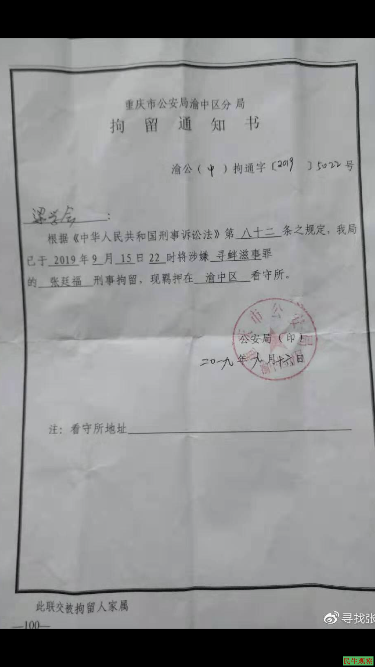 2019年9月15日,重庆维权人士张廷福,被重庆市公安局渝中区分局以涉嫌寻衅滋事罪刑拘,现羁押在渝中区看守所。家属经多方投诉后,才于9月16日拿到刑事拘留通知书,张廷福也从达州转至重庆渝中区看守所,得知成为逃犯的原因,是派出所以其涉嫌寻衅滋事罪,上传为网上追逃。