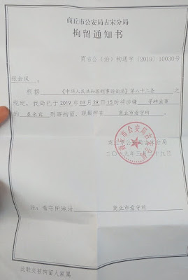 2019年3月28日,其被河南省商丘市警方带走传唤,次日,其家被查抄,当场搜走其私人电脑1台及境外出版发行的书籍3本,随后即被以涉嫌“寻衅滋事罪”刑事拘留,并送往商丘市看守所关押;同年5月5日,被商丘市睢阳区检察院以同罪由正式批捕,被指控因其擅自流览境外网站,并在推特上转发涉嫌攻击国家领导人的敏感言论。