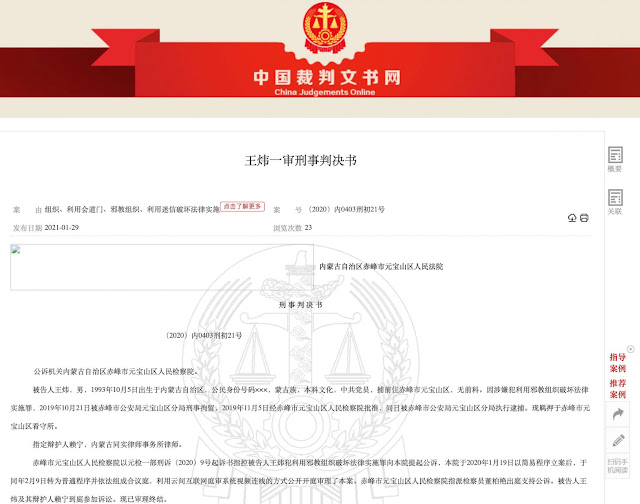 2019年10月21日,其被内蒙古自治区赤峰市元宝山区警方突然以涉嫌利用邪教罪刑拘,被关押在元宝山区看守所,自此失联;同年11月5日,被宝山区检察院以同罪名予以正式批捕,指控其自2016年至2019年9月间,多次非法通过翻墙软体观看“大纪元”节目、书籍、光碟并註册使用者Bruce Wong,多次向大纪元、新唐人电视台等境外网站投稿并发表反宣文章8篇次,并在推特上发表反宣推文40余条,其内容主要涉及:1、攻击党和政府,把香港“反送中”事件,比作六四事件等,并称“天灭中共”;2、支持港独人员和香港“反送中”行动,并发布相关支持性文章;3、赞同支持法轮功观点,并在“大纪元退党”网站发表“三退”说明等;因其反宣言行已严重触犯了政府得相关法律,随应被逮捕、判刑;后其案被检察院起诉移交至元宝山区法院,起诉书中建议法院应对其从重处罚;2021年1月30日,终被内蒙古赤峰市宝山区法院一审以“利用邪教组织破坏国家法律实施罪”判处有期徒刑4年,被处罚金人民币5000元,刑期至2023年10月20日。