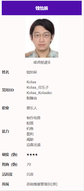 钱怡辰,1997年6月8日出生,家住上海市杨浦区许昌路630弄14号102室,音乐人,电音极道头,常用网名Kolaa、Kolaa_可乐子、Kolaa_Kolaako、骷髅翁,恶俗维基管理员,恶俗维基案当事人。