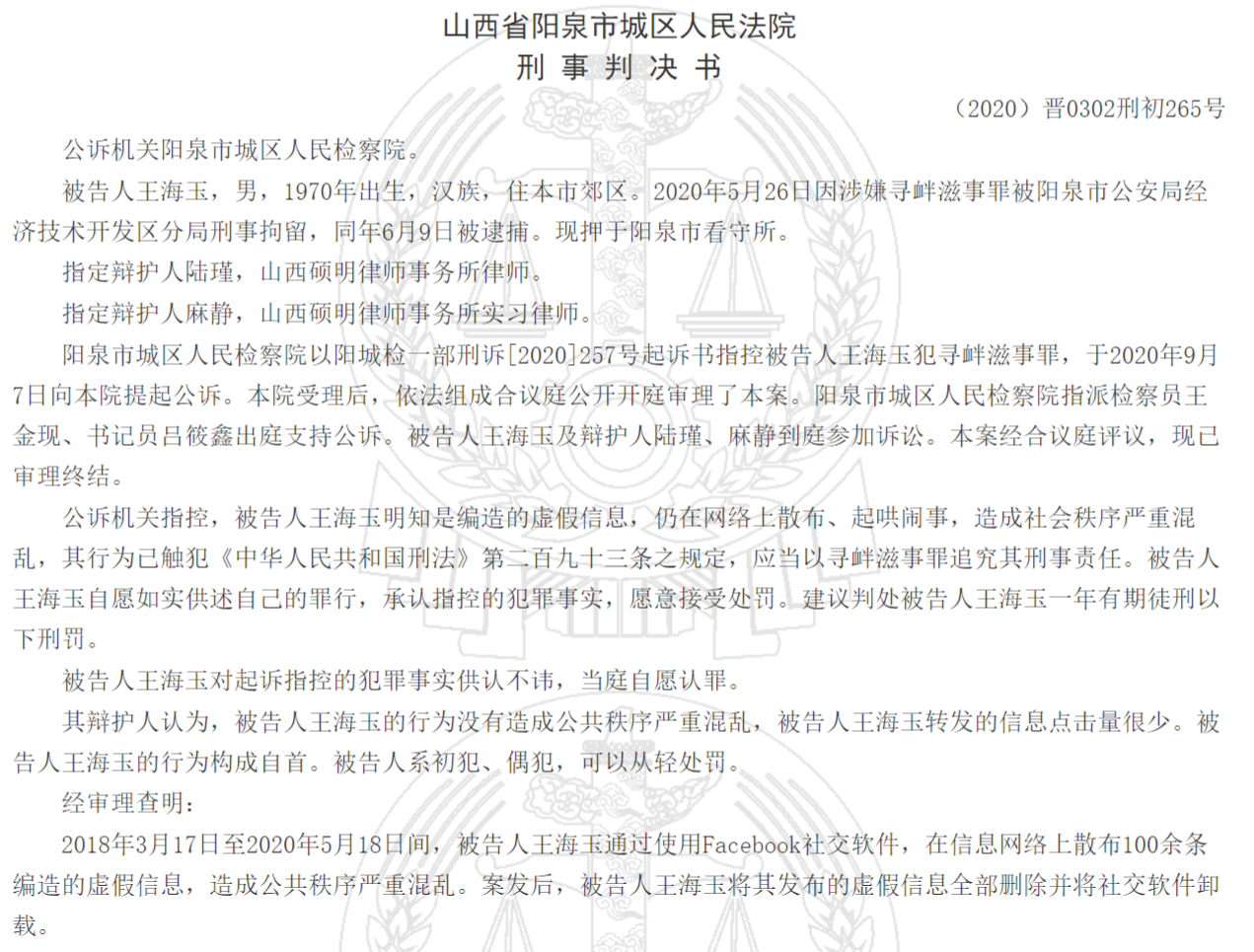 2020年5月26日,被山西省阳泉市经济技术开发区警方以涉嫌“寻衅滋事罪”抓捕、刑拘;同年6月9日,又被以同罪名转正式逮捕,并被指控其因曾连续2年多利用手机,“通过使用脸书(Facebook)社交媒体”,在信息网络上散布“编造的虚假信息,起哄闹事,造成公共秩序严重混乱”,案发后虽有悔意,“将全部所发虚假信息删除和社交软件尽都卸除”,但因其行为已触犯法律,所以构成犯罪。
