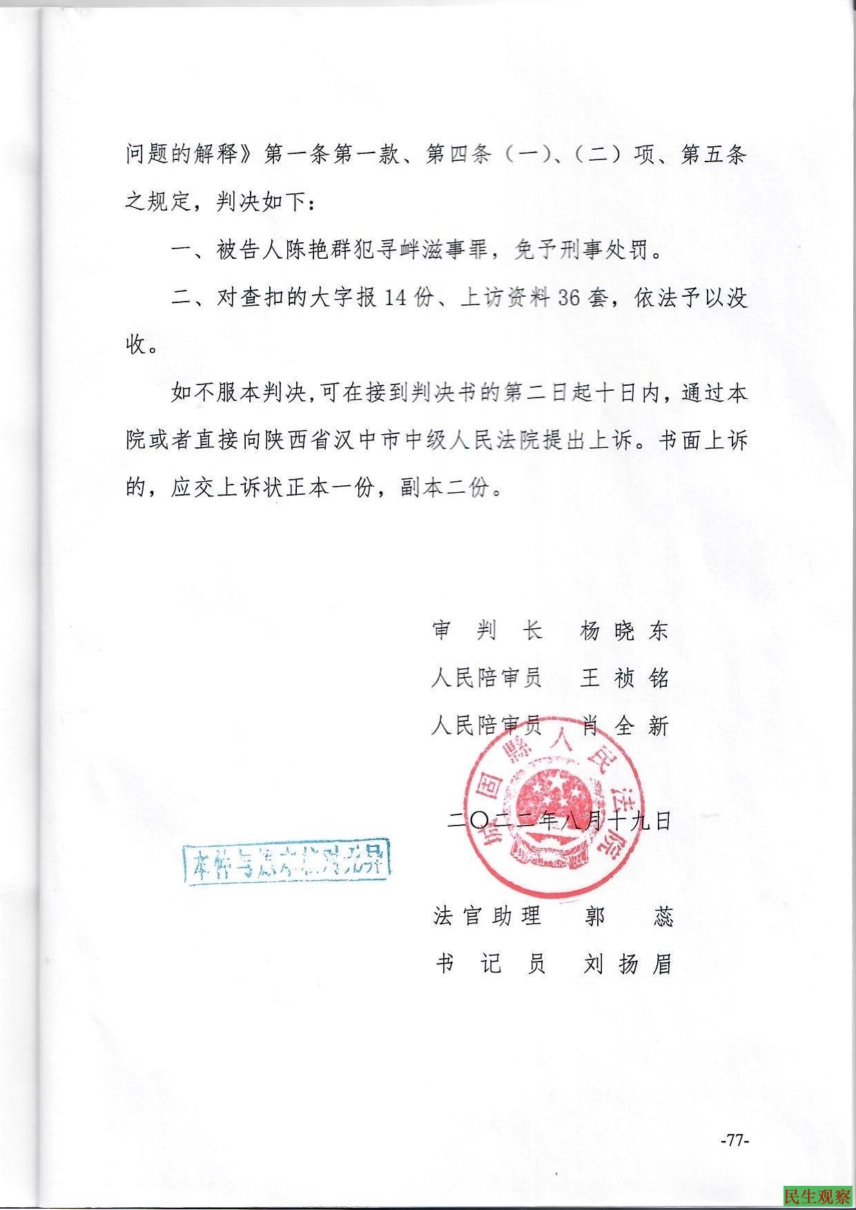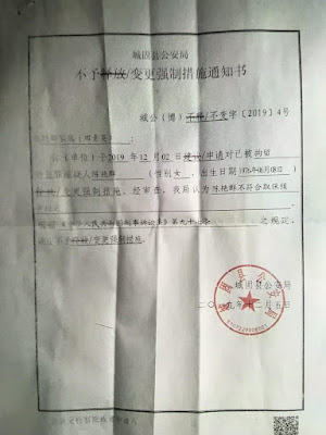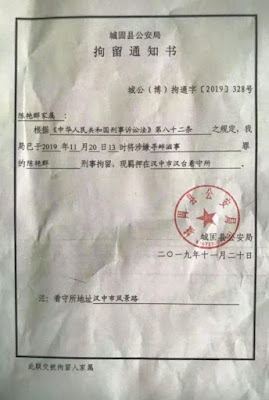 2019年11月19日,因在城固县宾馆门口将上访材料递交给国家义务教育均衡发展评估验收组的领导,但该领导在收下材料后又很快将材料退回,随后即被城固县警方拦截带走,次日被以涉嫌“寻衅滋事罪”刑拘,关押在汉中市汉台区看守所;2020年2月5日,又被警方变更强制措施而改为监视居住;2021年1月25日,再被城固县检察院以同罪名正式批捕;2021年8月25日,其案在陕西省城固县法院开庭受审,当日未予宣判,至2022年4月25日,又经第二次庭审,决定对其继续监视居住6个月;2022年8月19日,其案再次被庭审,宣判其“寻衅滋事罪”罪成,但鉴于其家庭情况困难,其行为虽已构成犯罪,但尚未造成严重后果,犯罪情节轻微,故判处免予刑事处罚;其对宣判不服,已于同日向汉中市中级法院提起上诉;其未成年女儿因其被捕而受刺激,曾多次自杀,幸被人救下。