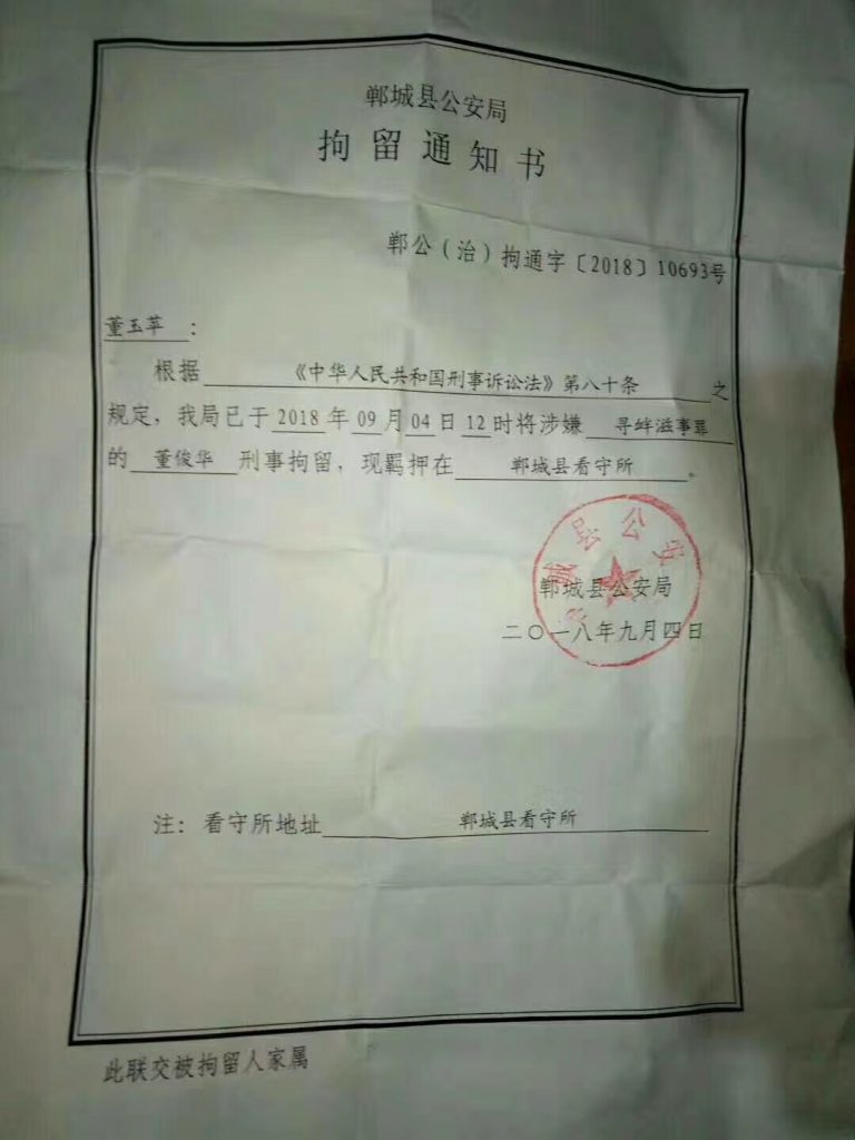 在一份由郸城县公安局出示的逮捕通知书中显示,疫苗受害儿童家长董俊华已被以涉嫌“寻衅滋事”的罪名执行逮捕,通知书上的日期为2018年9月19日。关押在 郸城县看守所。