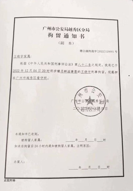 2022年12月初,王晓宇因围观广州市海珠广场白纸抗议活动被抓捕,2022年12月4日,被广州警方以寻衅滋事罪名刑事拘留,羁押于广州市越秀区看守所,当局拒绝家属和律师会见。