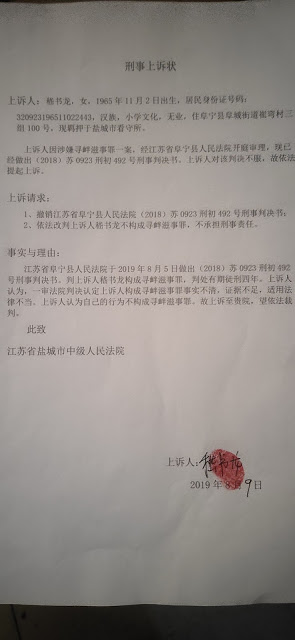 2018年2月5日,再被刑拘,后被执行逮捕,控其在网上发举报控告阜宁及其他地方当局的文章,尤其是曾在常州女子监狱时被酷刑的文章。此案于2019年3月7日才在盐城市阜宁县法院开庭审理。8月5日公布一审判决书。嵇书龙被阜宁县法院以“寻衅滋事罪”判刑4年,刑期至:2021年11月18日。