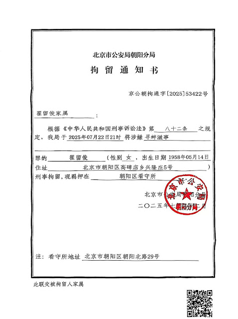 2025年7月22日,翟留俊女士被朝阳区公安分局以“寻衅滋事罪”刑事拘留,现羁押于朝阳区看守所。此次翟留俊被刑拘,起因于她家在北戴河租房做生意。翟留俊一家在北京经营一家餐馆,经常要从北戴河进货海鲜,所以常年在北戴河就近租房做生意。而北戴河因为是当局高层开会和疗养的地方,便成为当局维稳防范的敏感地区。今年7月,翟留俊的属地警察要求翟留俊回北京,不准待在北戴河。翟留俊不从,因为一家要生存,就要做生意。于是警察被警察抓捕,后来翟留俊被警察押回北京,随后就被北京市朝阳区公安分局以“寻衅滋事罪”刑事拘留。