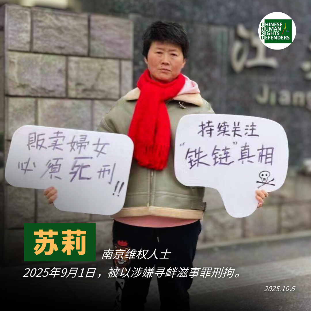 2025年9月1日上午9时26分,南京维权公民苏莉被南京市建邺区公安分局以涉嫌寻衅滋事罪从家中强制带走。苏莉当日被建邺区公安分局以涉嫌寻衅滋事罪刑事拘留,现被羁押在南京市看守所。
