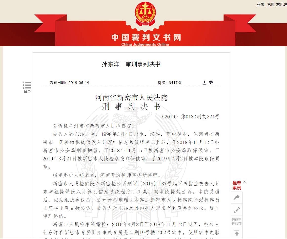 2019年再被警方拘捕;2019年3月21日虽曾被新密市检察院取保候审,但3月25日其案又被新密市检察院以“提供侵入电脑系统工具罪”正式起诉;4月2日曾再次被检察院取保候审,不久后又被收监逮捕;2019年5月31日,被河南省新密市法院以同罪名判处有期徒刑3年,缓刑4年,罚金2万元,并没收电脑。