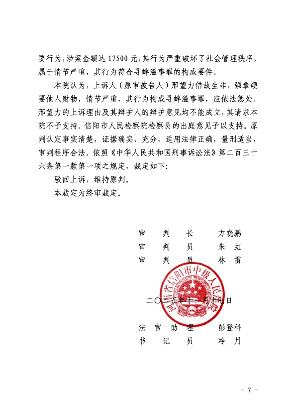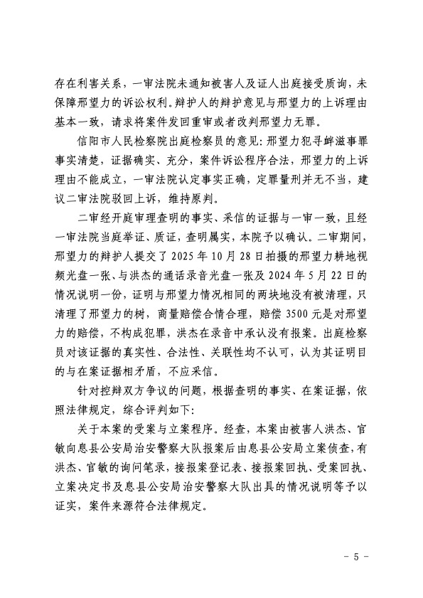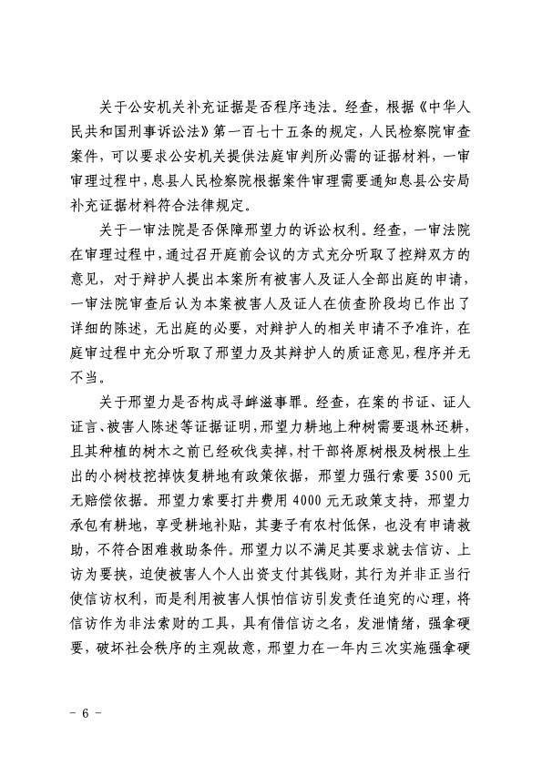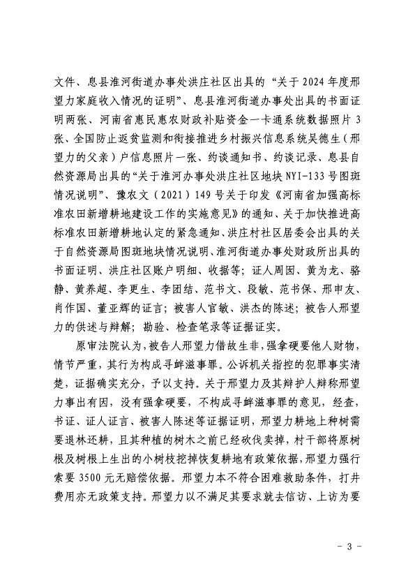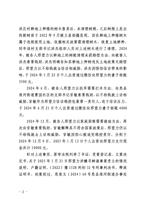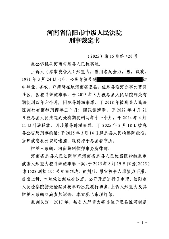 据邢望力之子邢鉴通报:“近日家属收到河南息县法院(2025)豫1528刑初106号判决书,该判决书无证据证明邢望力有罪,所谓“证人、受害人”长期稳控、监视甚至非法拘禁邢望力及家人,庭审无人出庭质证。该案却“ 重口供、轻证据”,实行有罪推定,以寻衅滋事罪判处家父邢望力有期徒刑3年。” 2025年11月17日,二审维持原判。